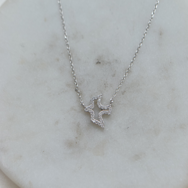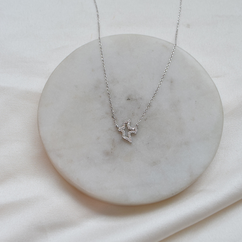 Et elegant halskjede i sterlingsølv med en fin svale dekorert med klare zirkonia steiner. Det lette og luftige designet gir et feminint og moderne uttrykk, mens de små steinene tilfører en diskret og eksklusiv glans.