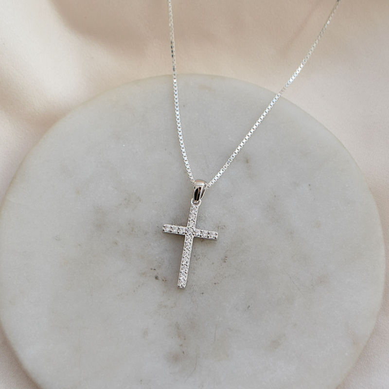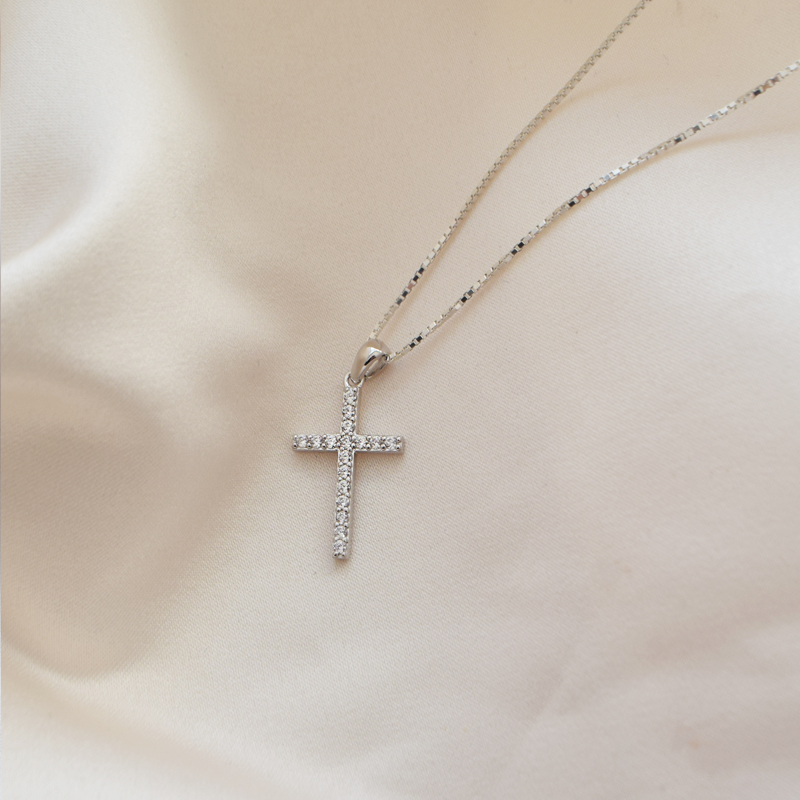 Sølvkjede med korsanheng belagt med steiner