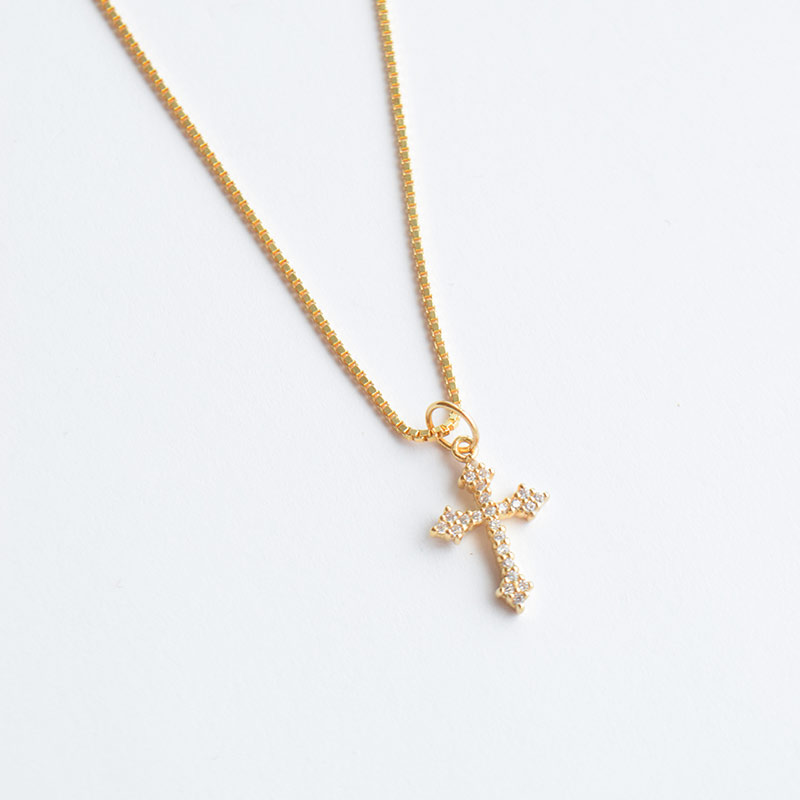 "Runa" halskjede i 18k forgylt sterlingsølv med kors og zirkonia-steiner