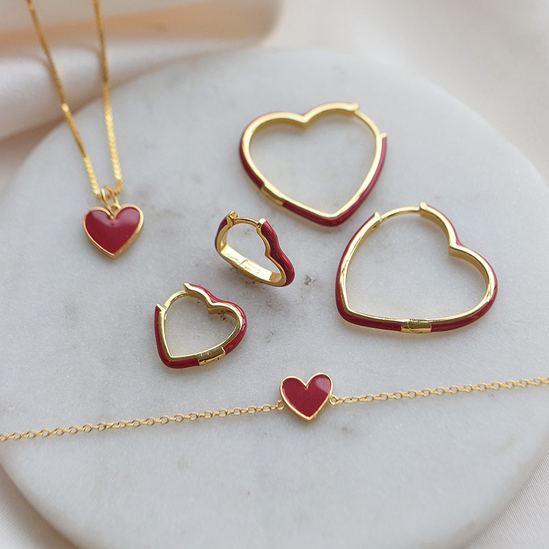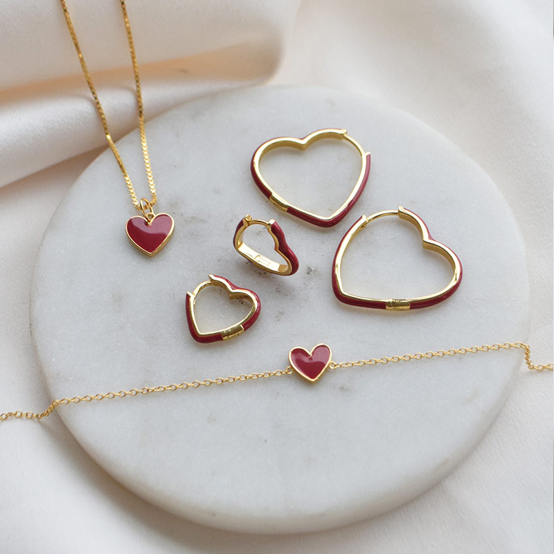 Valentina Heart Necklace er et delikat halskjede med et hjerteformet anheng i sterling sølv belagt med 18 karat gull og dekorert med dyp rød emalje. Hjertet måler 10 mm og gir et feminint og romantisk uttrykk.