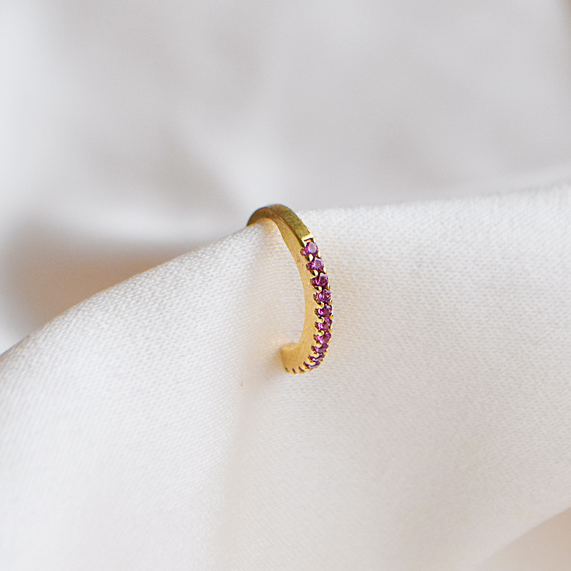 Camille earcuff er utført i 18k forgylt sterlingsølv og har et smalt, jevnt design med zirkonia steiner plassert tett langs yttersiden. Earcuffen finnes med zirkonia steiner i tre farger: hvit, lilla eller lyserød.