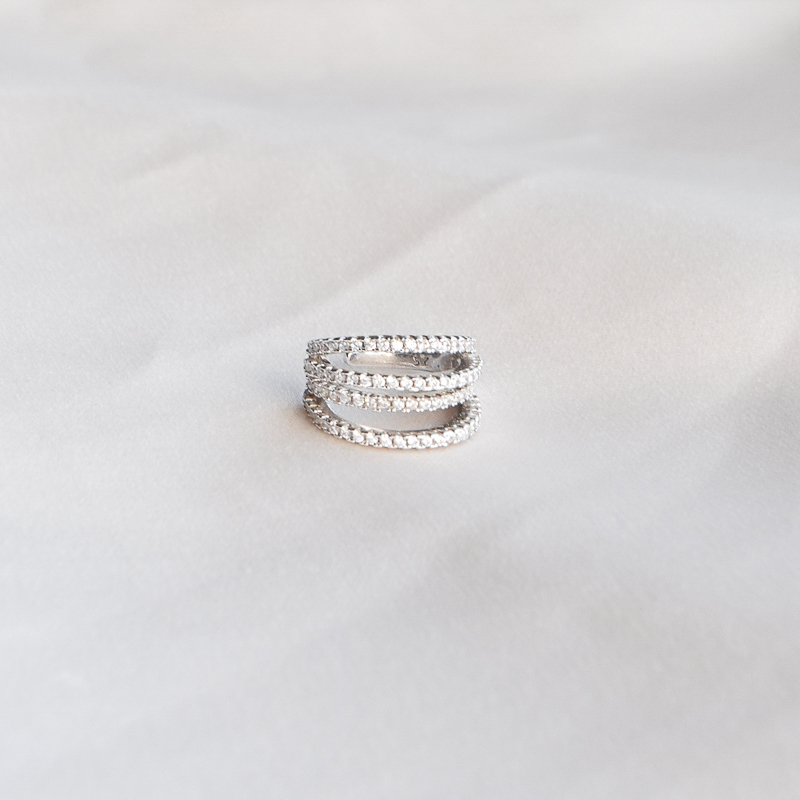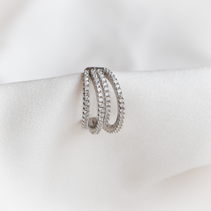 Shine earcuffen er fremstilt i sterlingsølv og har et design med flere buede lag plassert i ulike nivåer. Hvert lag er besatt med klare zirkonia steiner som gir et jevnt og skinnende uttrykk.