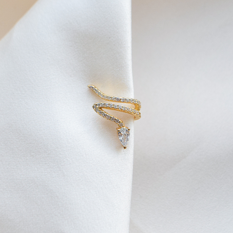 Snakey earcuff er laget i 18k gullbelagt sterling sølv og formet som en snoet slange som følger øret i flere buer. Smykket er besatt med zirkonia langs hele slangens kropp, noe som gir et tydelig og vakkert uttrykk.