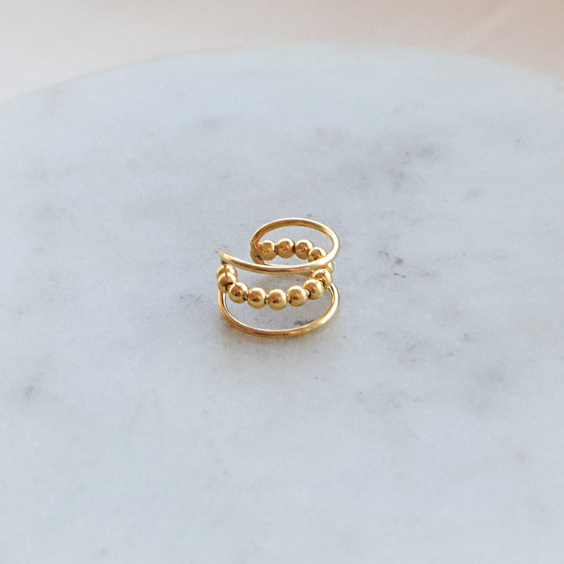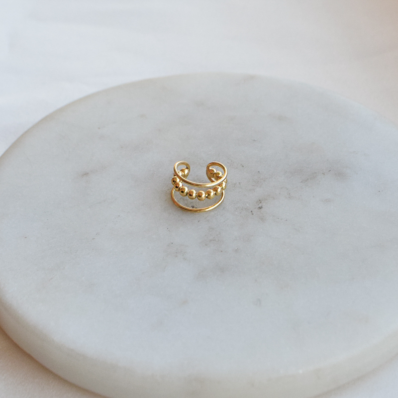 Eliana earcuff er laget i 18k gullbelagt sterling sølv og består av tre ringer samlet i ett smykke. De to ytterste ringene er glatte, mens den midterste ringen er formet av små kuler som gir en diskret variasjon i uttrykket.