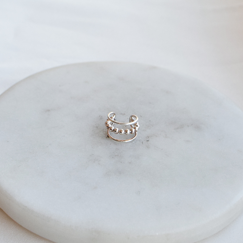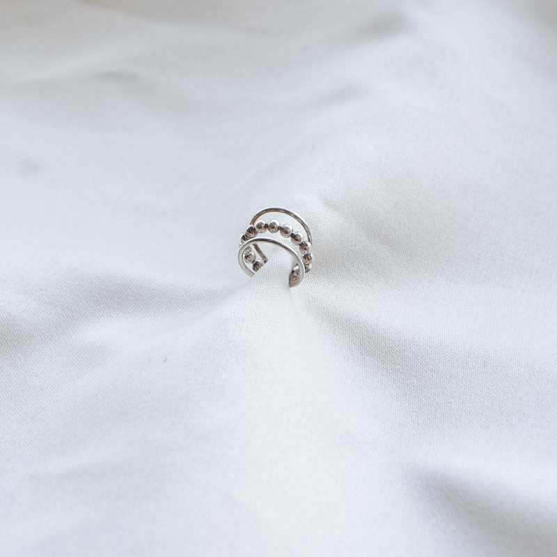 Eliana earcuff er laget i sterling sølv og består av tre ringer samlet i ett smykke. De to ytterste ringene er enkle og glatte, mens den midterste ringen er formet av små kuler som gir en diskret variasjon i uttrykket.