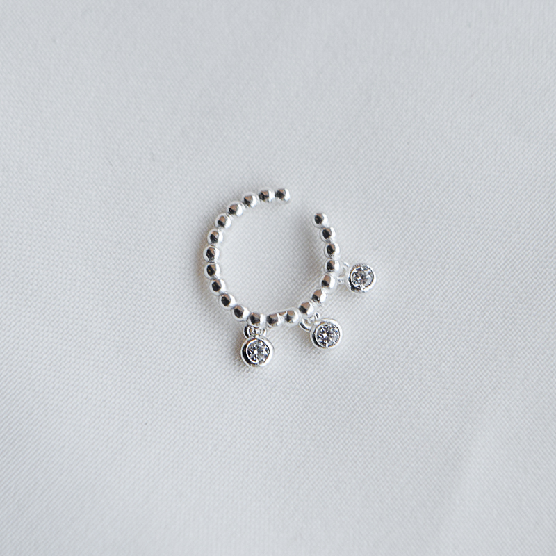 Denne earcuffen er designet i sterling sølv og består av en smal ring med tre små, runde zirkonia som henger fritt og gir lett bevegelse ved øret. Kombinasjonen av den faste ringen og de hengende steinene gir smykket et mer levende uttrykk, uten at det føles tungt.