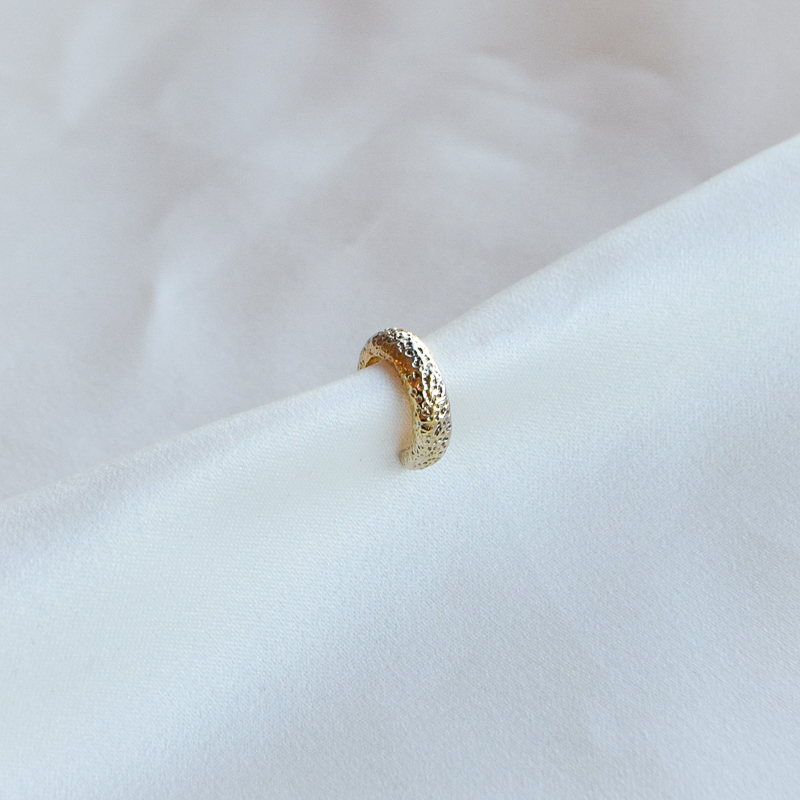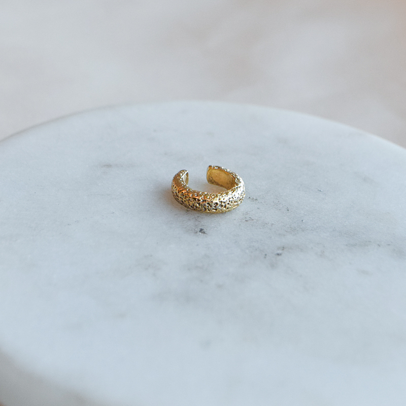 Levine earcuff er et elegant og karakterfullt øresmykke i 18k gullbelagt sterling sølv med en vakkert strukturert overflate. Det organiske designet gir et eksklusivt uttrykk der den varme gullbelagte finishen fremhever strukturen og skaper et levende spill i lyset.