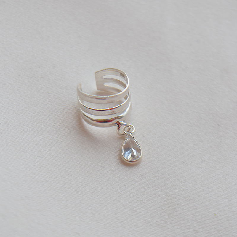Sena earcuff er et markant og elegant øresmykke i sterling sølv med et lagdelt design bestående av tre myke ringer. Den dråpeformede zirkoniaen som henger lett under earcuffen, tilfører bevegelse og et vakkert, feminint glimt som fanger lyset ved hver bevegelse.