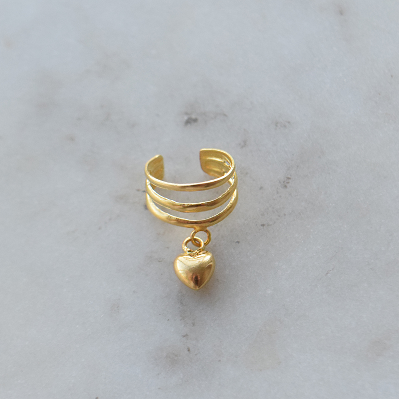 Lumi earcuff er et feminint og elegant øresmykke i 18k gullbelagt sterling sølv med et lagdelt design bestående av tre myke ringer. Under earcuffen henger et lite hjerteformet anheng som tilfører bevegelse og et varmt, romantisk uttrykk.