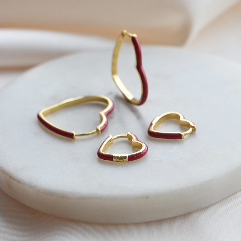 Valentina Small Heart Hoops er små, hjerteformede hoops i sterling sølv belagt med 18 karat gull og dekorert med dyp rød emalje. Et delikat smykke med et romantisk uttrykk.