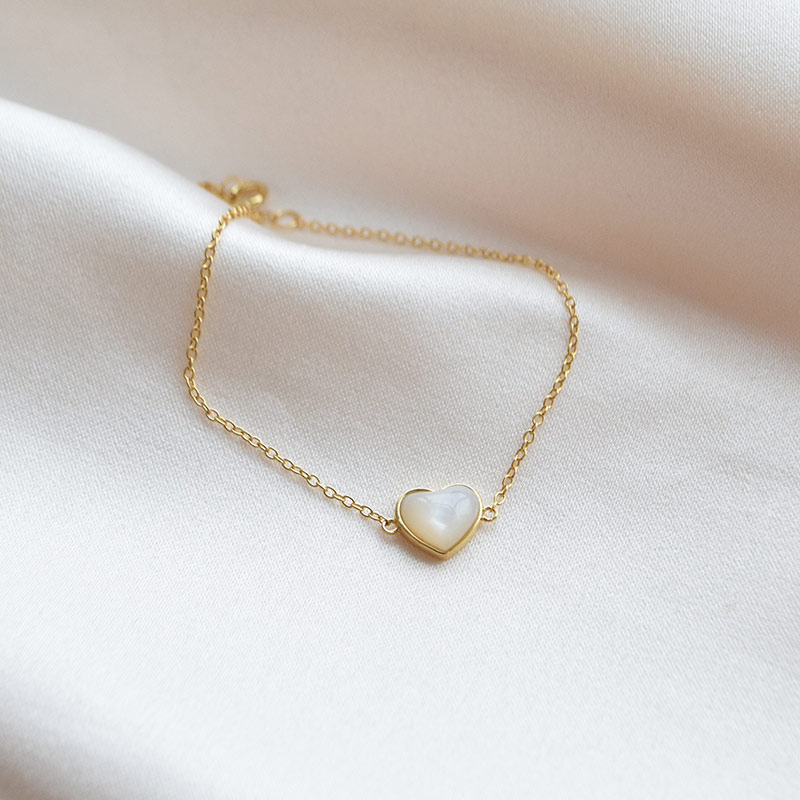 Feminint armbånd i 18 karat forgylt sterling sølv med et delikat hjerte i ekte perlemor. Den gyldne tonen sammen med perlemorens myke glans skaper et elegant og romantisk uttrykk som passer både til hverdag og spesielle anledninger.