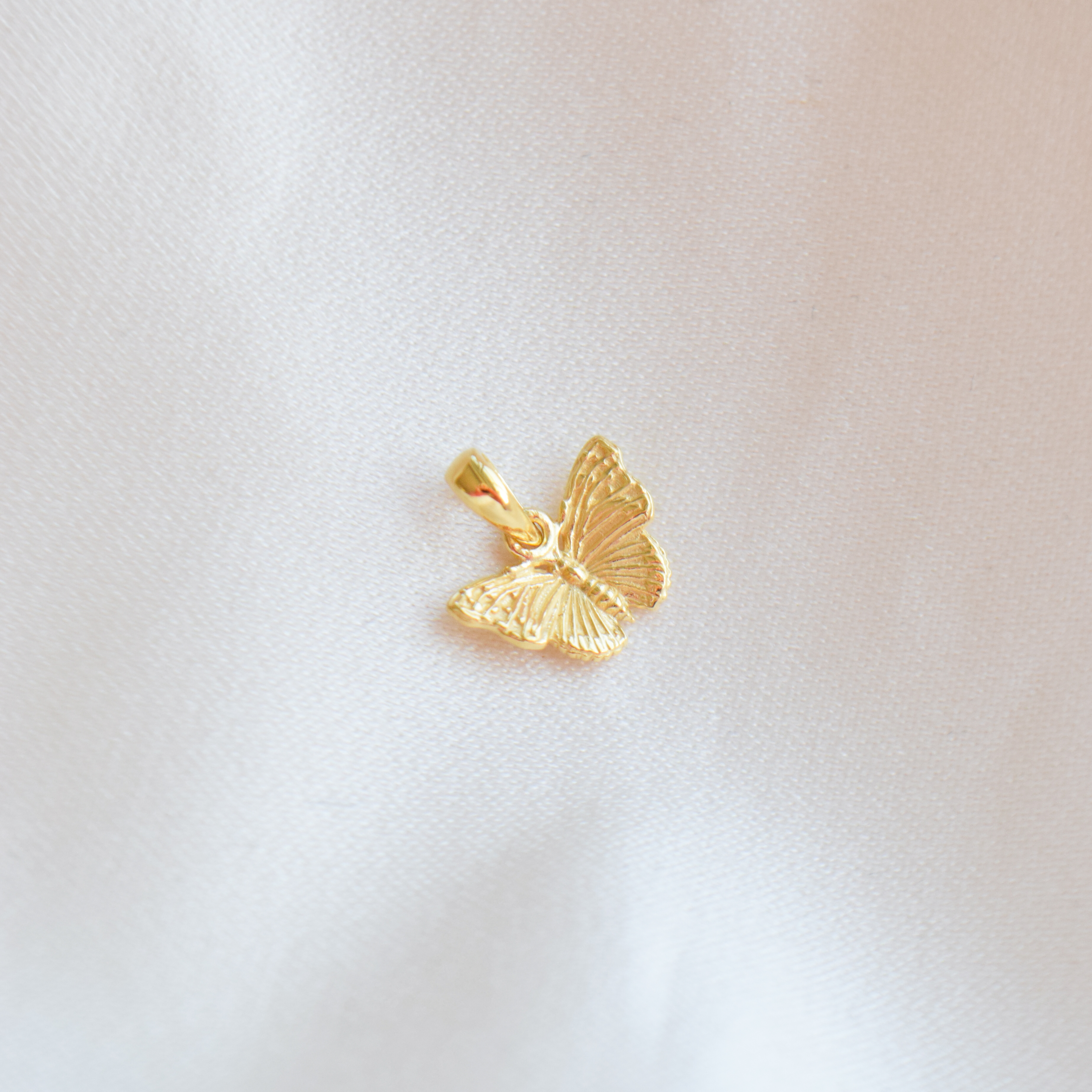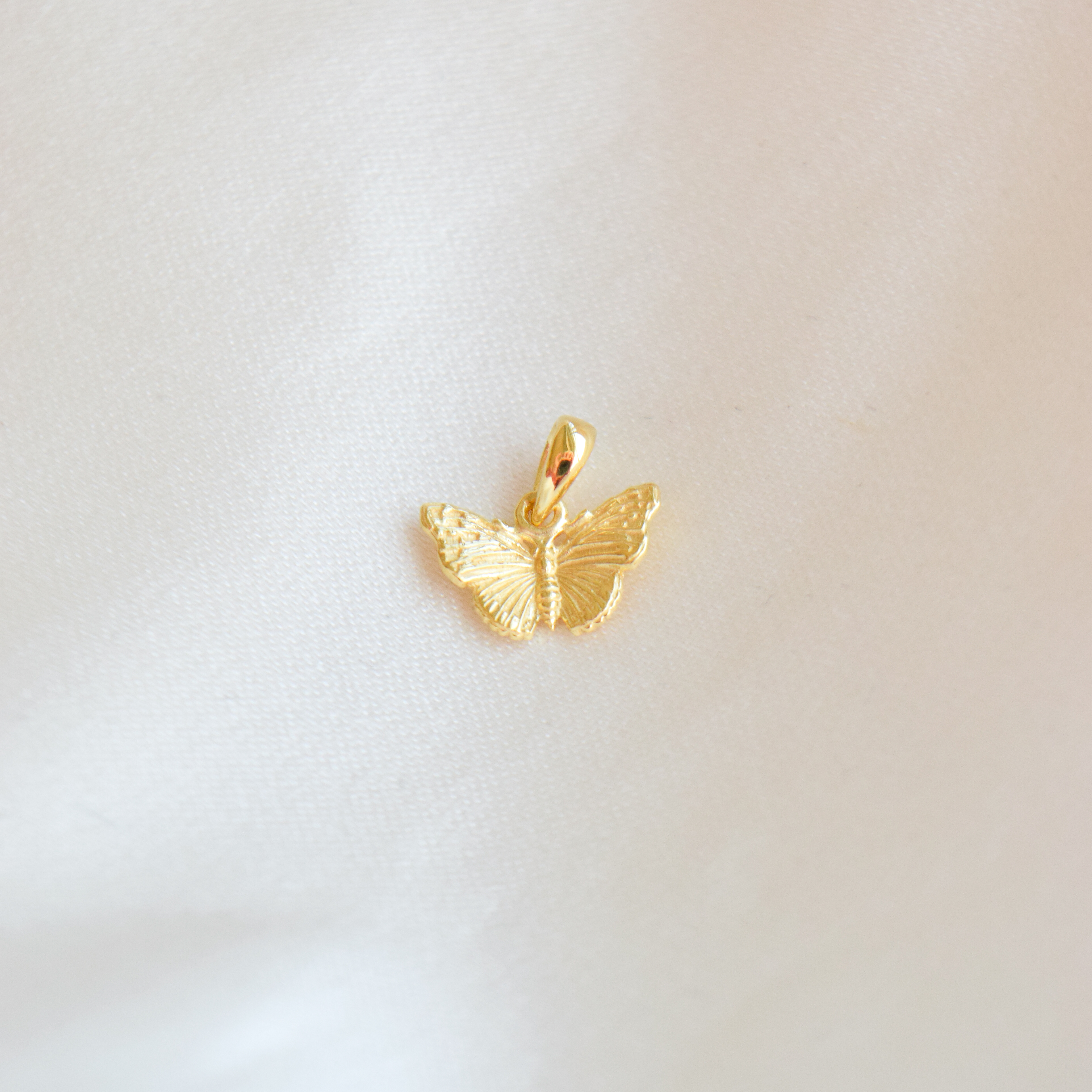 Det delikate anhenget er formet som en detaljert sommerfugl med vakkert utskårne vinger som fanger lyset og gir et levende uttrykk. Det enkle, men betydningsfulle designet gjør smykket perfekt for de som ønsker et personlig preg med en lett og sommerlig stemning.