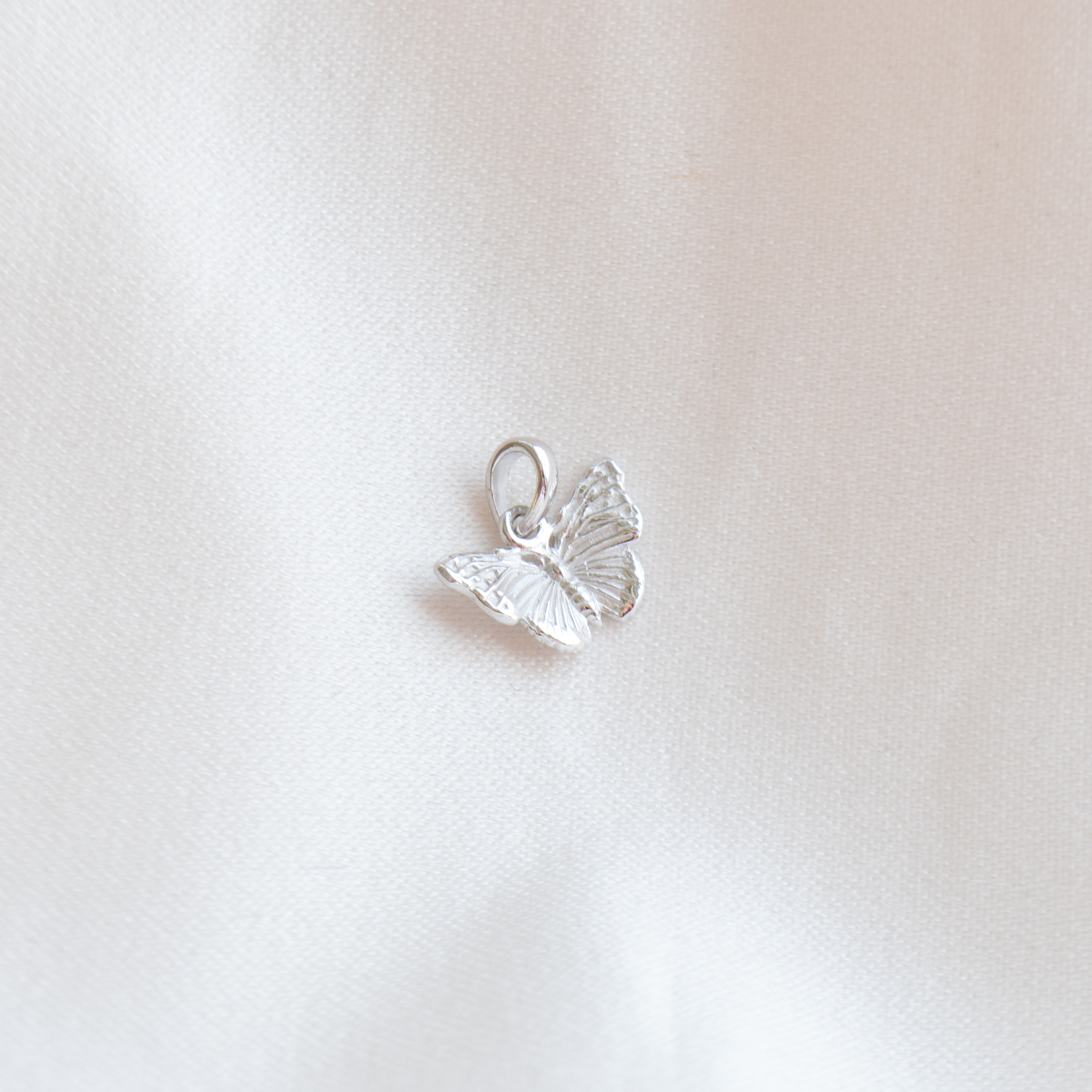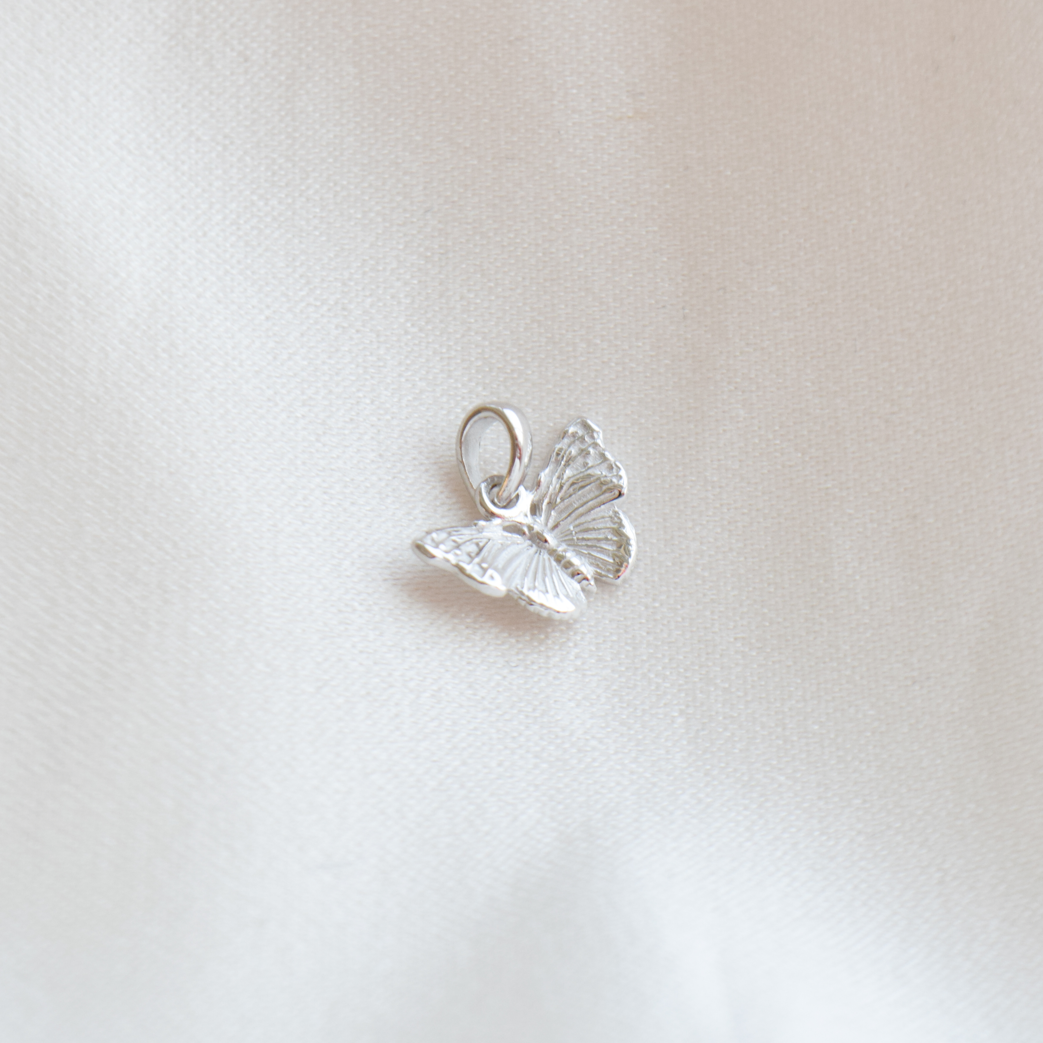 Det delikate anhenget er formet som en detaljert sommerfugl med vakkert utskårne vinger som fanger lyset og gir et levende uttrykk. Det enkle, men betydningsfulle designet gjør smykket perfekt for de som ønsker et personlig preg med en lett og sommerlig stemning.