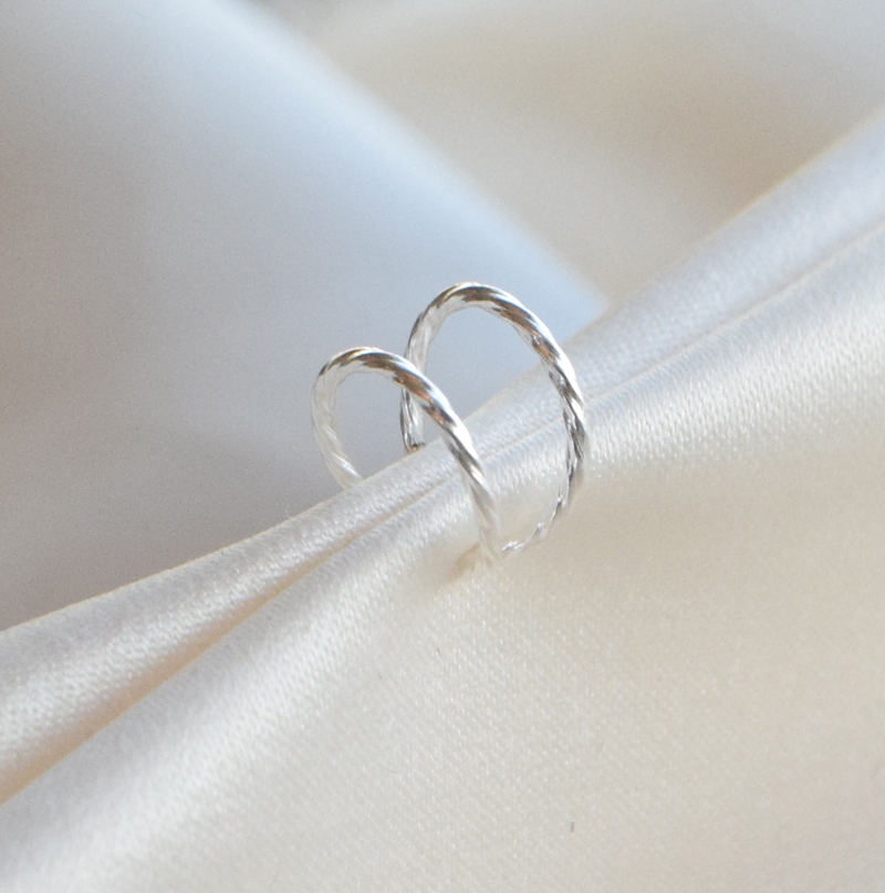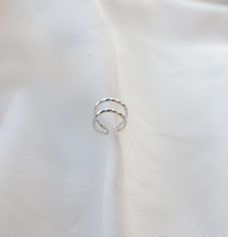 Dobbeltring-designet skaper en følelse av lag og gir et mer markant uttrykk enn en klassisk enkel earcuff, samtidig som formen forblir lett og balansert. Den tvistede strukturen bryter sølvets glans og gjør smykket velegnet til både minimalistiske looks og mer sammensatte stylinger.